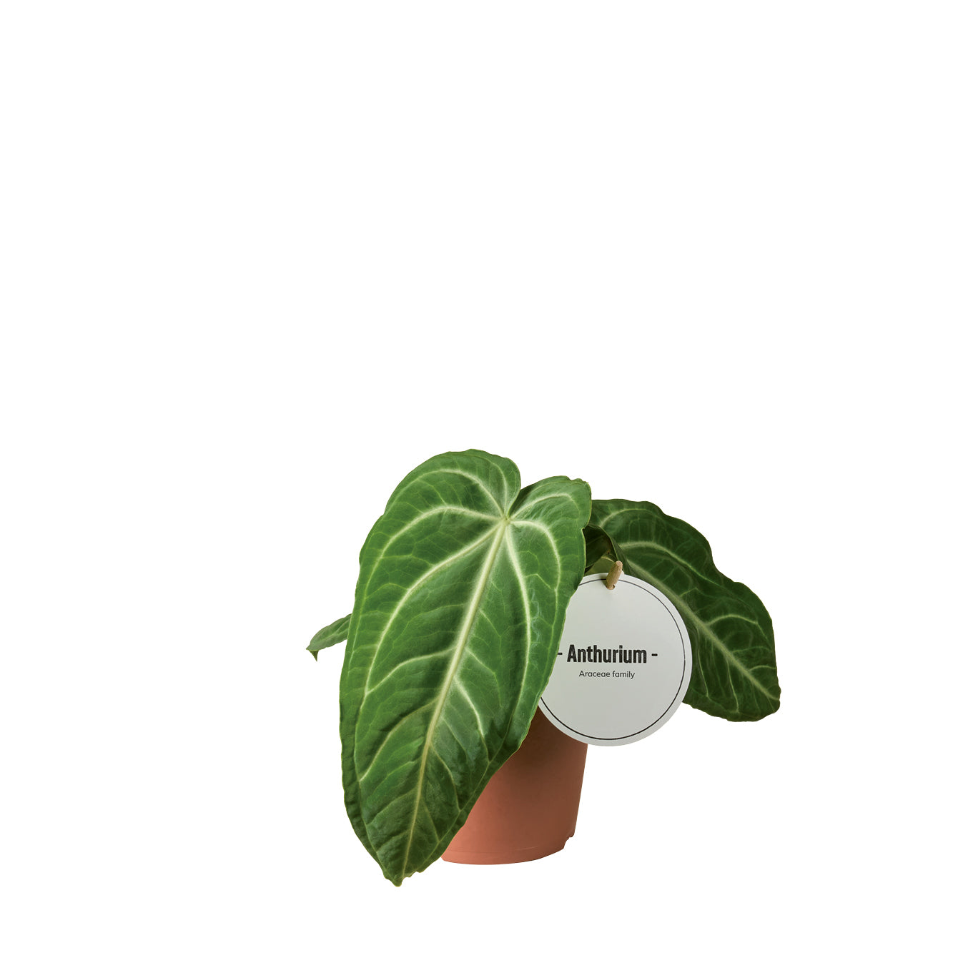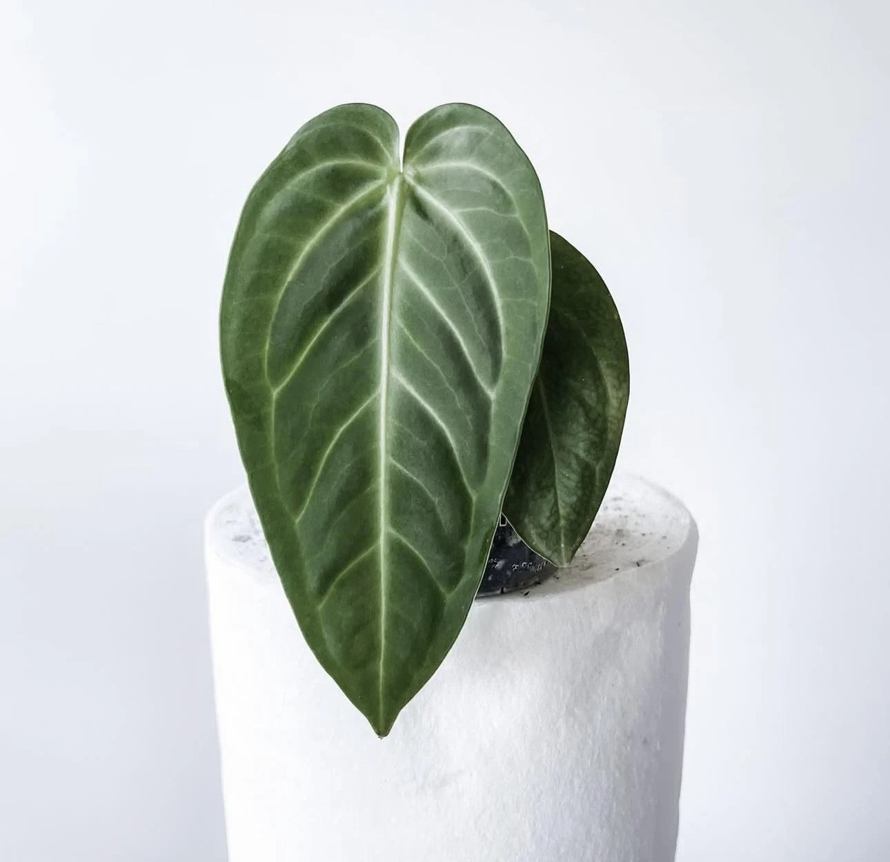 Anthurium villenaorum is a striking aroid known for its velvety, silvery, deeply veined leaves.