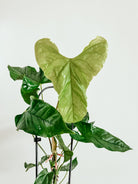 Grows large, elongated heart-shaped leaves with glossy green surfaces.