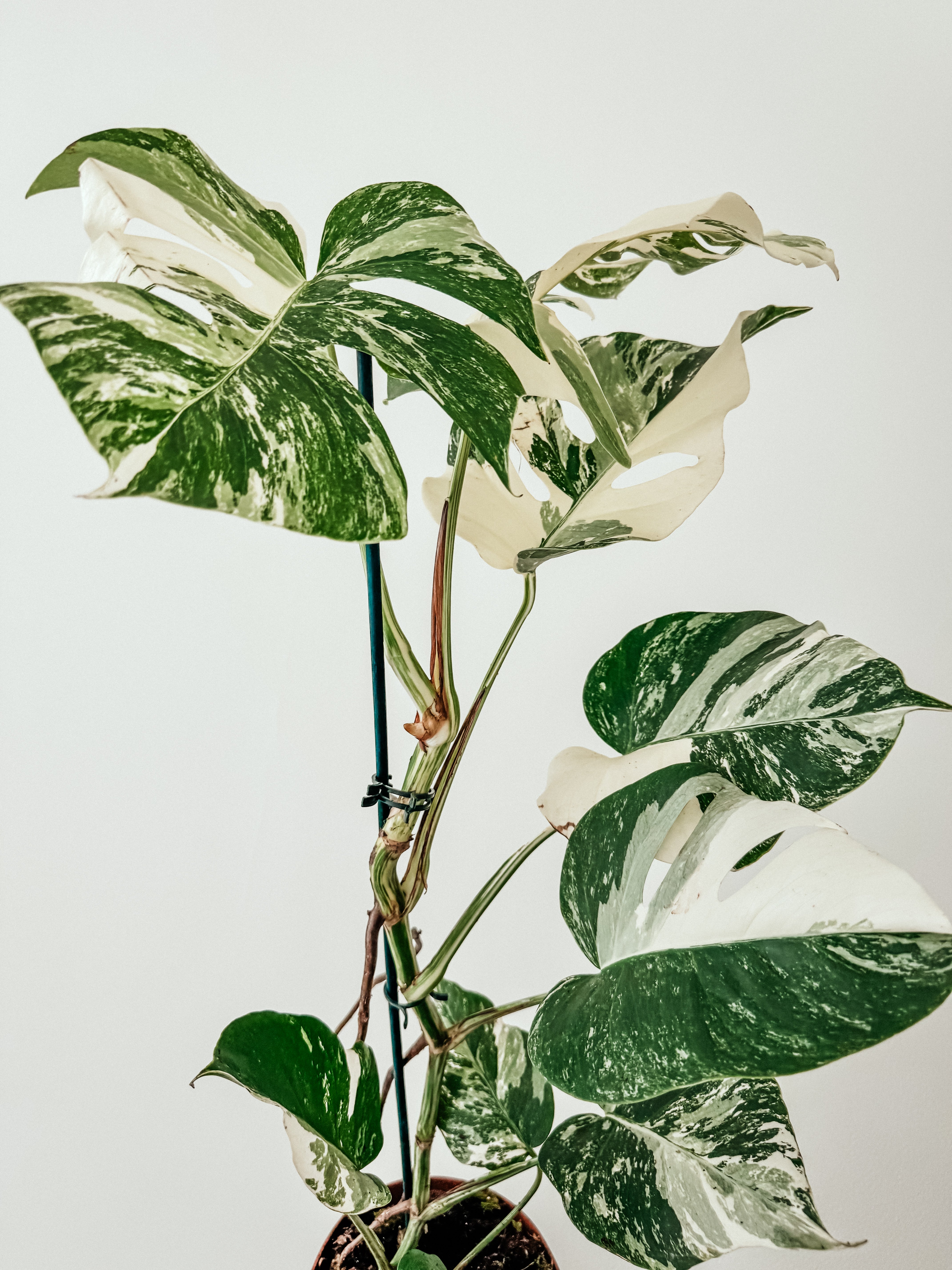 Variegated sections have no chlorophyll, so the plant can’t photosynthesize as efficiently; it needs more light than a standard Monstera to stay healthy.