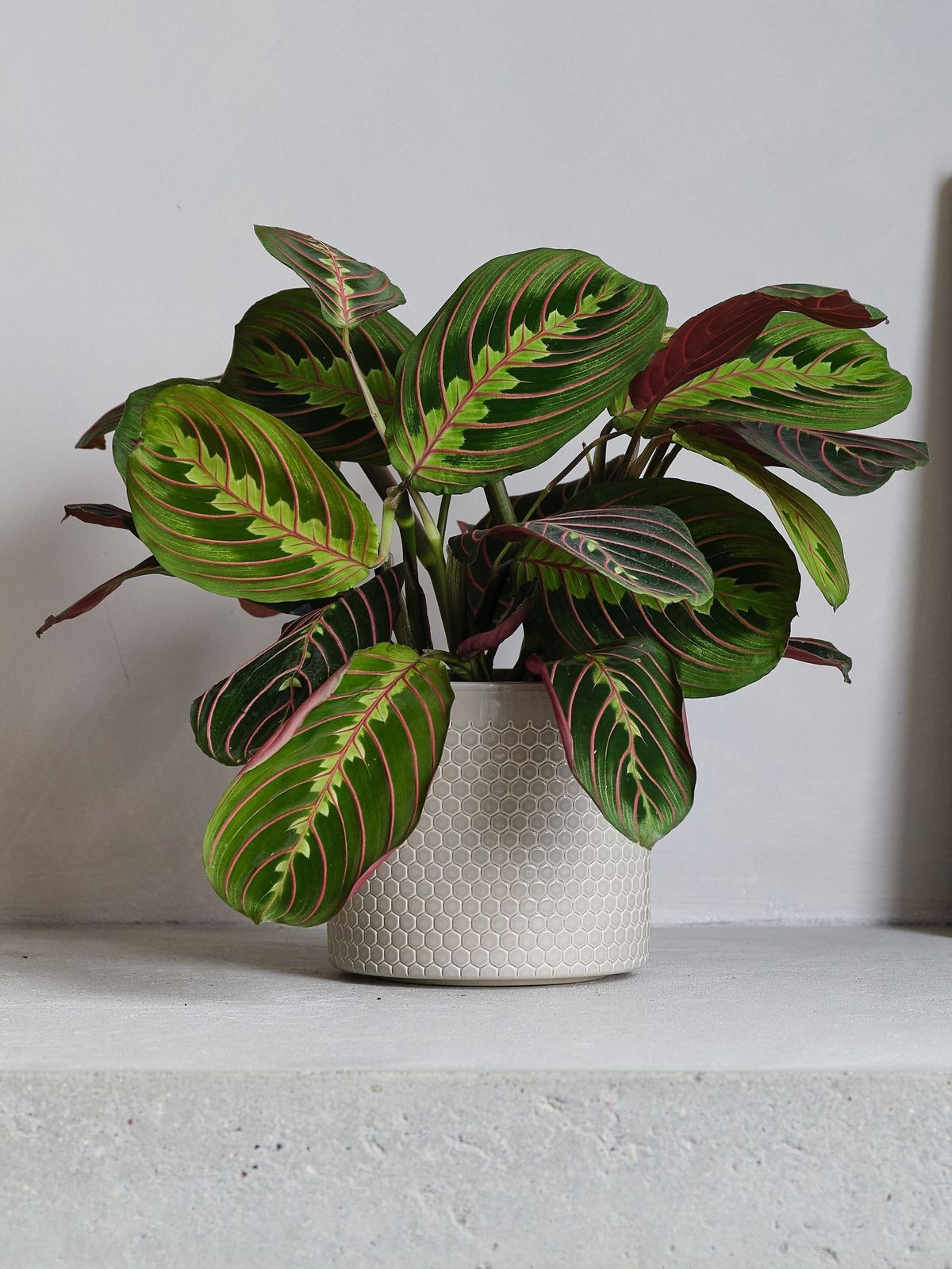 Maranta Leuconeura’s is known for doing a little ‘dance’ throughout the day, meaning you’ll see the leaves lying flat during the day and closing upwards at night as if in a prayer. This behaviour is called nyctinasty, and it happens as a response to changes in the sunlight. Maranta is a great plant to grow in a hanging basket as she’ll grow wide and low from it.