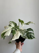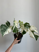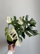 The Monstera Albo features large, heart-shaped leaves with dramatic variegation. The variegation typically consists of white or cream-colored patches or streaks on the dark green leaves. The patterns can vary, with some leaves having more variegation than others. The variegated foliage adds a unique and eye-catching touch to any indoor space.