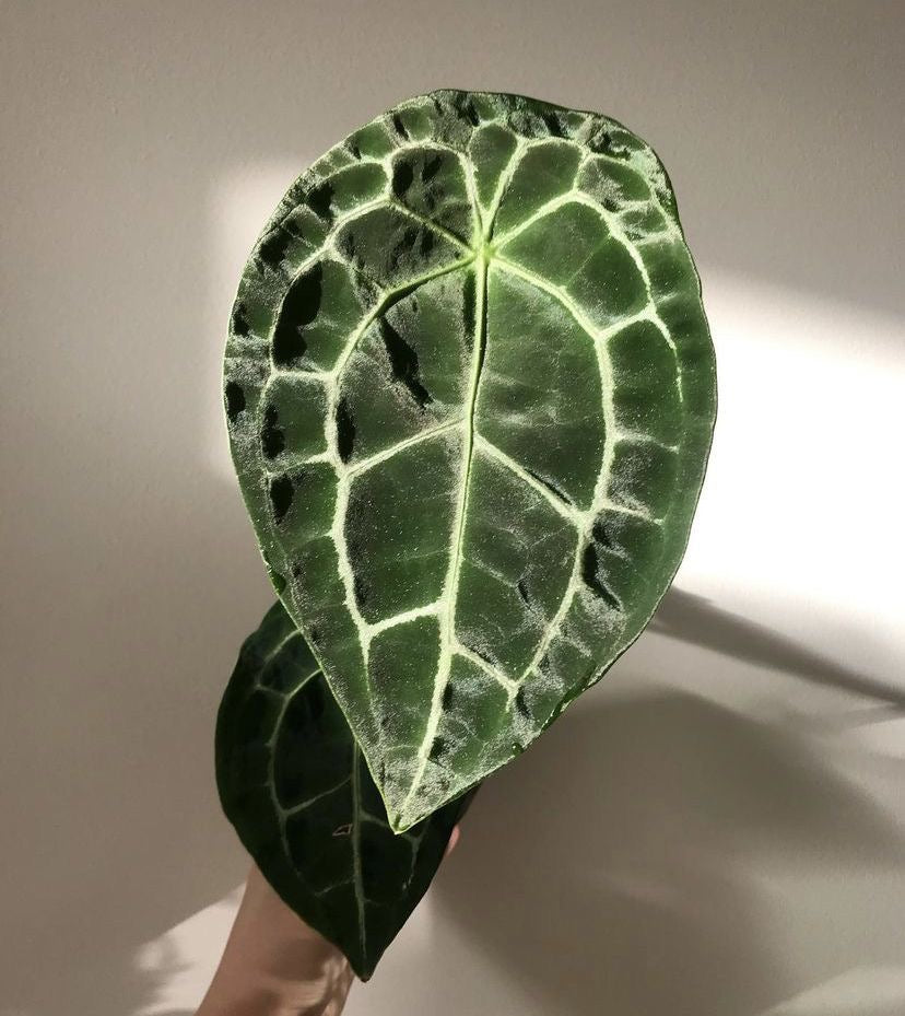 The Anthurium Forgetii is a stunning aroid known for its oval, pendant-like leaves with no sinus (no split at the top)and prominent silver veins. It's native to Colombia and thrives in humid, warm, forest-like conditions.